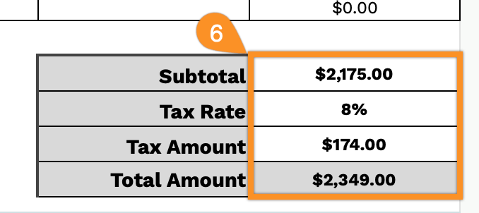 6. Add the applicable tax rate, and the template will automatically calculate the subtotal, tax amount, and final total.