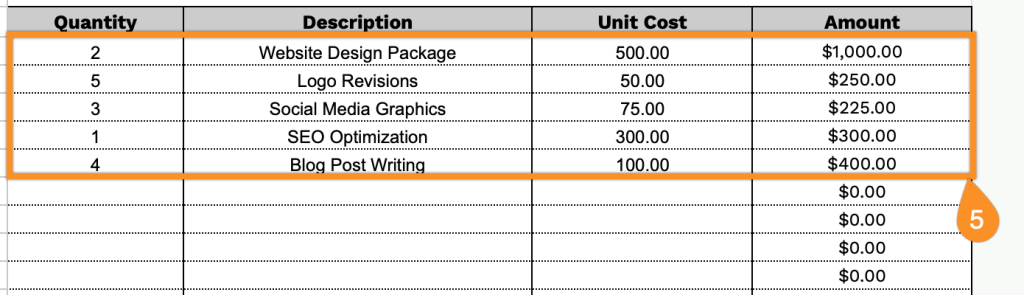 5. Enter the quantity, item or service description, and unit cost for each line item; the template will automatically calculate the line total.