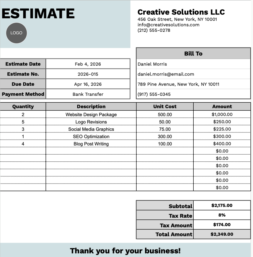 Our Estimate Template provides a clean, professional format for presenting service quotes to clients.