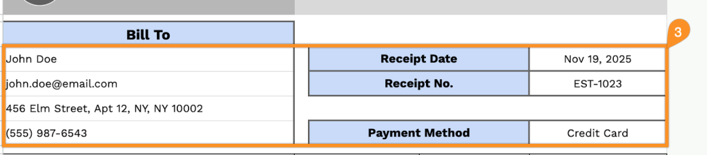 • Detailed customer and transaction information: Dual-column layout featuring “Bill To” fields that capture customer name, email, address, and phone number, alongside transaction-specific details including receipt date, receipt number, and payment method, ensuring complete record-keeping for every sale or service transaction.