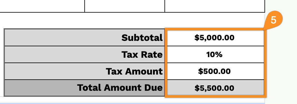 5. Apply the appropriate tax rate. The template will then calculate the subtotal, tax, and total amount due.