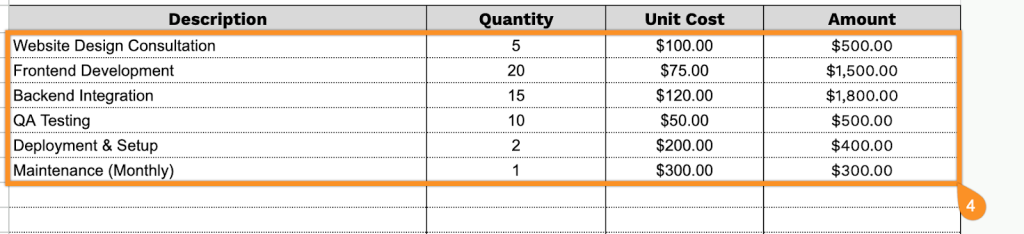 4. List the items or services you’re providing, including quantity and price. The template will automatically calculate each line total.