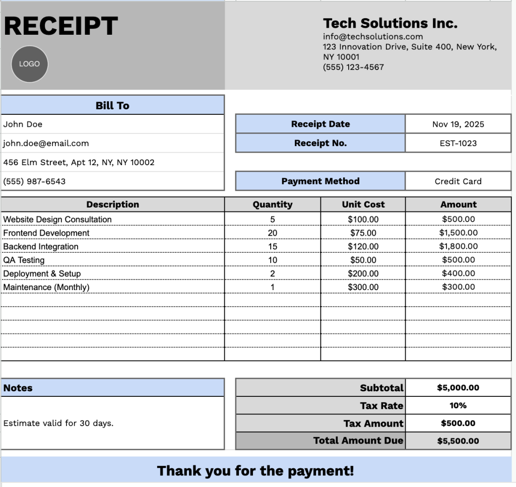 Free☝️ Estimate Receipt Template (Google Sheets, Excel, Word, Google Docs, & PDF Downloads)