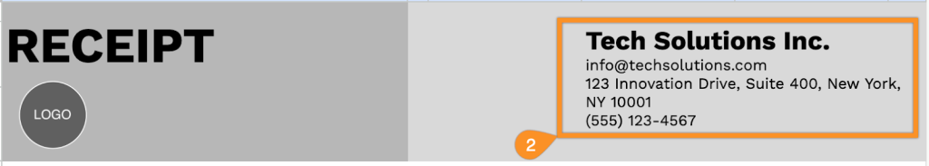 • Comprehensive company branding section: Dedicated input fields for your business name, email address, physical address, and phone number at the top of the receipt, ensuring professional identification and easy customer contact information on every transaction.