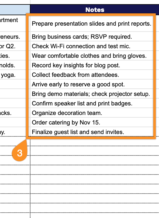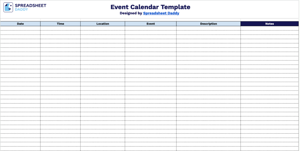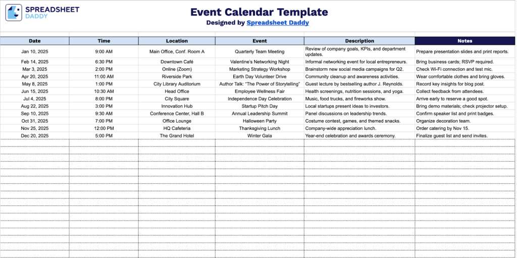 - Flexible notes field for additional context: A dedicated Notes column allows you to record supplementary information such as attendee lists, preparation requirements, special instructions, or follow-up tasks. This keeps all event-related details in one place, eliminating the need for separate documentation.
