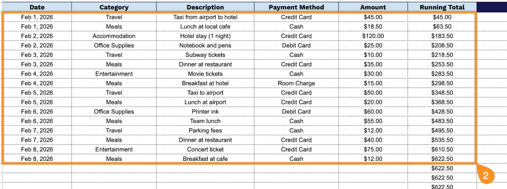 - Automatic running total calculation: Each expense entry includes a Running Total column that progressively calculates your cumulative spending as you add new items, providing real-time visibility into your total expenditures without manual calculation or cross-referencing.