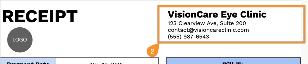 • Complete header section with clinic branding fields: Customize the top of your receipt with your clinic name, complete address, email, and phone number, creating a professional letterhead that reinforces your practice’s identity on every transaction document.