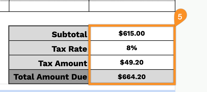 5. Enter your applicable sales tax rate, and the template will instantly calculate the subtotal, tax amount, and final total due.
