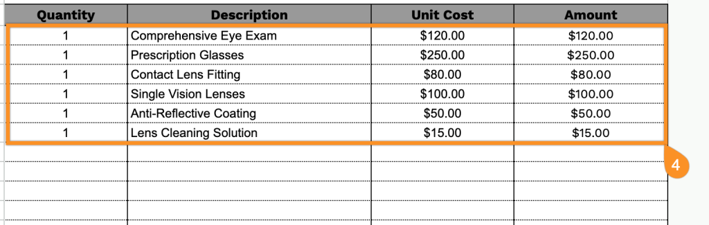 4. For each item, enter the item number, description (like “comprehensive eye exam,” “contact lens fitting,” or “prescription eyeglasses”), quantity, and unit price. The template will automatically calculate the total for each line.