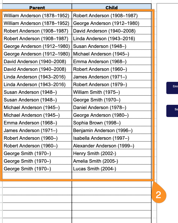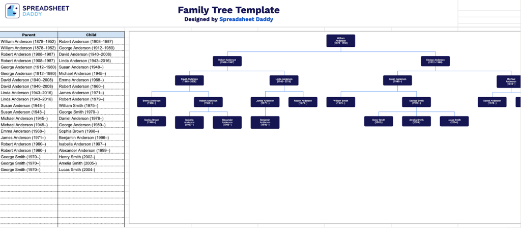 Our Automatic Family Tree Template uses a simple two-column structure where you enter parent-child relationships, and it generates a visual family tree chart from that data.