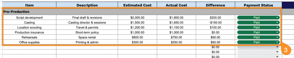 3. List each expense under categories such as Cast, Crew, Equipment, Locations, Props, Post-Production, and Marketing. For every item, add a brief description, the estimated cost, the actual cost, and the payment status.