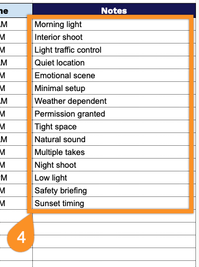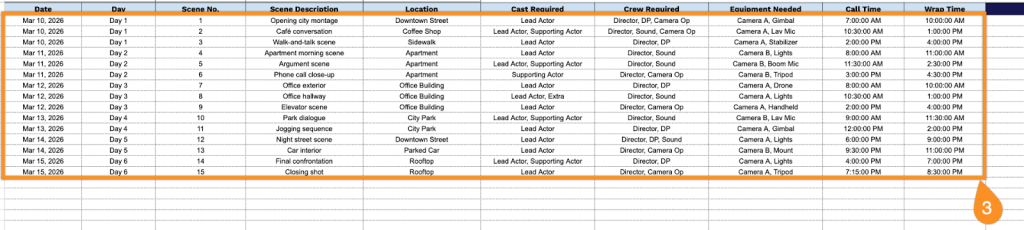 - Time management and production notes fields: Built-in Call Time and Wrap Time columns allow you to establish clear daily schedules for cast and crew arrivals and departures, while a dedicated Notes column provides space for special instructions, weather considerations, backup plans, or any scene-specific details that require attention during production.