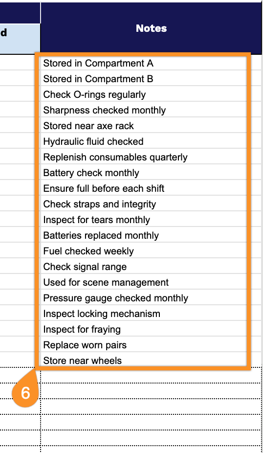 - Flexible notes column: A maintenance notes section allows teams to record specific observations, repair history, replacement recommendations, or any special handling requirements for individual items. This creates a complete equipment history that’s easy to reference.