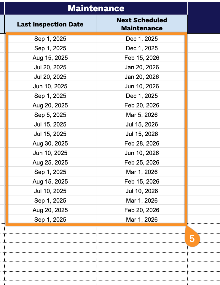 - Maintenance scheduling system: Dedicated columns for Last Inspection Date and Next Scheduled Maintenance help ensure compliance with safety regulations and prevent equipment failures by tracking when items were last serviced and when upcoming maintenance is due.