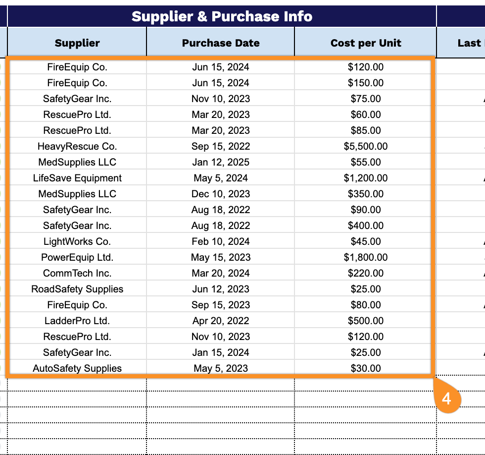 - Supplier and purchase documentation: Built-in columns capture important procurement data, including Supplier name for vendor management, Purchase Date to track equipment age, and Cost per Unit for budgeting and replacement planning purposes.