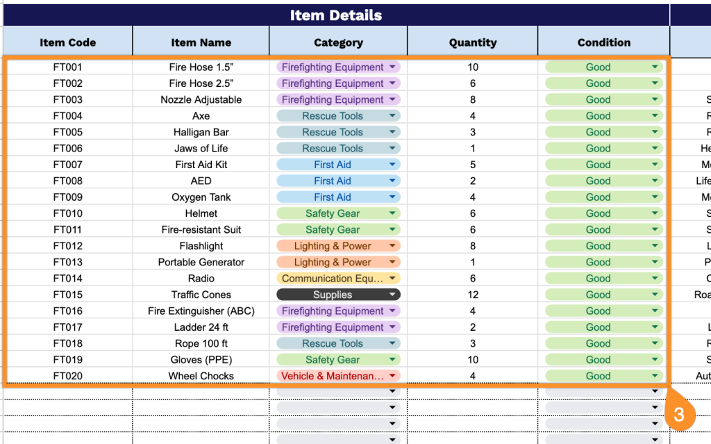 - Comprehensive item tracking columns: Each inventory item is organized with essential identification fields, including an Item Code for systematic cataloging, an Item Name for precise identification, a Category for grouping similar equipment types, a Quantity to track stock levels, and a Condition status to monitor the operational readiness of each piece of equipment.