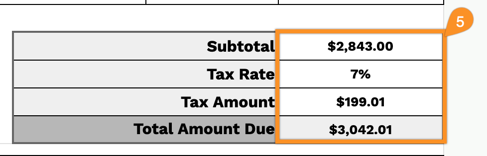 5. Apply the relevant tax rate, and the template will automatically calculate the subtotal, tax, and total amount due.