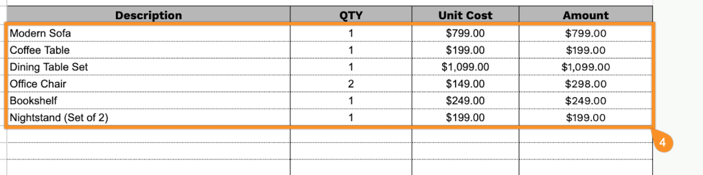 - Itemized product table with automatic calculations: Features four essential columns (Description, QTY, Unit Cost, Amount) with pre-formatted rows to list multiple furniture items, with the Amount column automatically calculating the total for each line item based on quantity and unit cost.