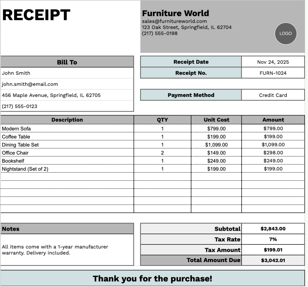 1. Get your furniture receipt template in Excel, Word, or PDF, or customize it in Google Sheets or Docs.