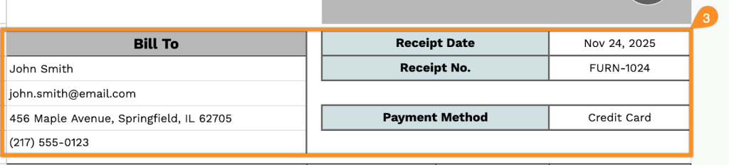 3. Fill out the “Bill To” section with your customer’s information, along with the receipt date, receipt number, and payment method.