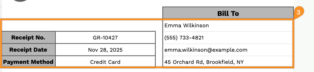 3. Fill in the “Bill To” section with the recipient’s information, along with the receipt date, receipt number, and payment method.