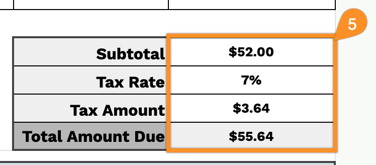 5. Enter the applicable tax rate. The template will automatically calculate the subtotal, tax amount, and total amount due.
