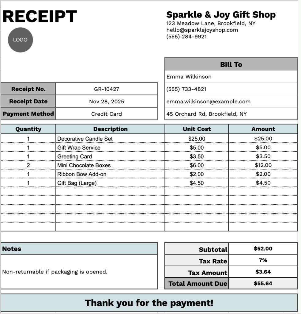- Customer and transaction block: Structured areas for the recipient’s name, receipt number, receipt date, and payment method ensure each gift receipt captures all essential transaction details.