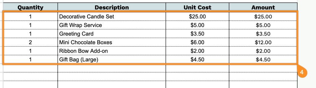 4. List the items you are supplying. Add the quantity and price for each item, and the template will automatically calculate the line totals.