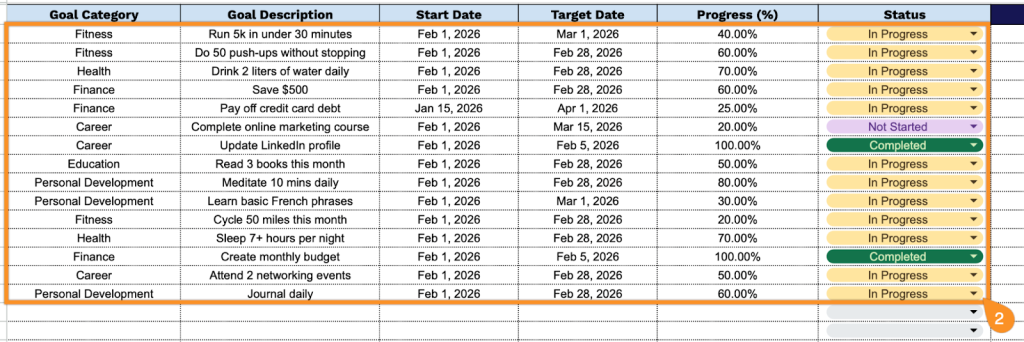 - Comprehensive goal tracking columns: The template features six essential columns including Goal Category for organizing goals by type (personal, professional, health, etc.), Goal Description for detailed objective documentation, Start Date and Target Date fields for timeline management, a Progress percentage tracker to monitor completion status, and a Status column to indicate whether goals are in progress, completed, or pending.