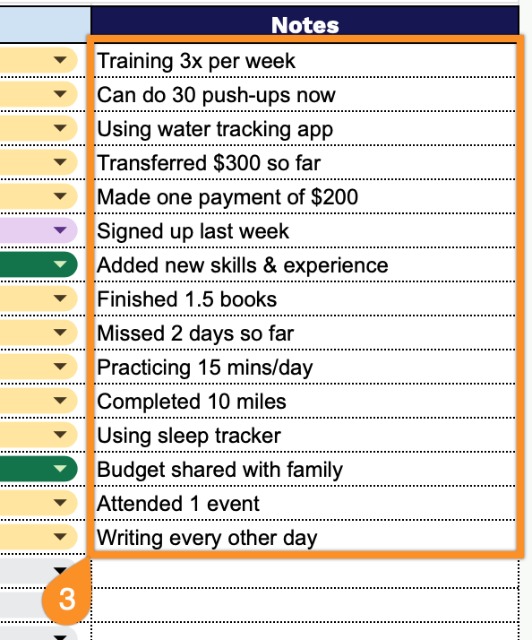 - Detailed notes section: The Notes column offers ample space to record important context, obstacles encountered, action steps taken, milestone achievements, or any other relevant information that helps you maintain momentum and document your journey toward each goal.