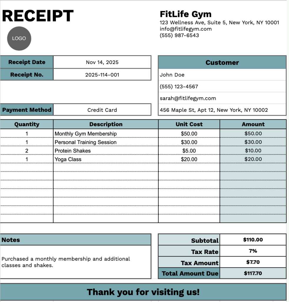 Free☝️ Gym Receipt Template (Google Sheets, Excel, Word, Google Docs, & PDF Downloads)