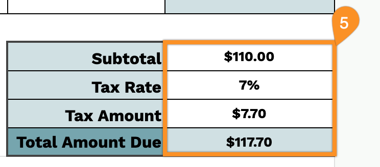 5. Apply the relevant tax rate, and the template will calculate the subtotal, tax amount, and total due.