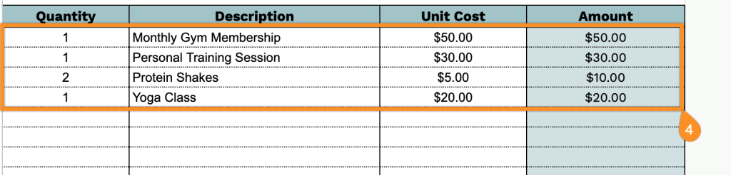 • Itemized transaction table: A structured table with four columns (Quantity, Description, Unit Cost, and Amount) allowing you to list multiple services, memberships, personal training sessions, or products purchased in a single transaction.