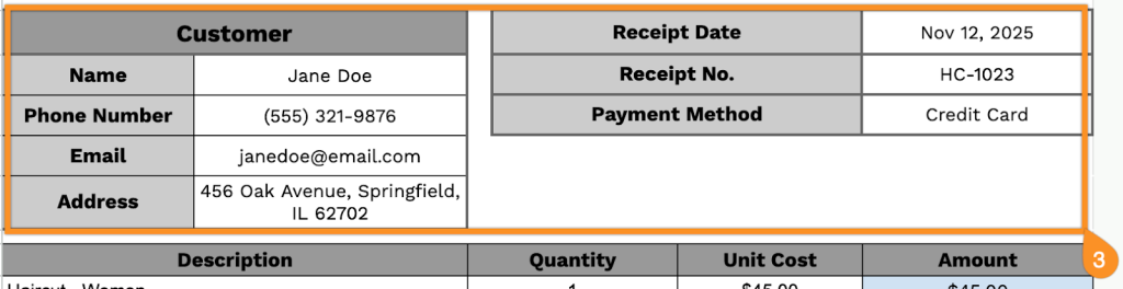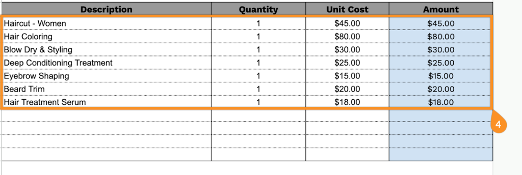 - Flexible itemized service table: A structured table with four columns (Description, Quantity, Unit Cost, Amount) and pre-formatted rows allows you to list multiple services such as haircuts, coloring, treatments, and styling, with automatic calculation fields for each line item amount.