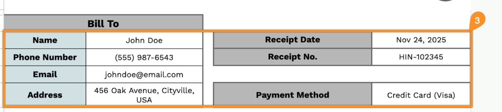 - Bill to section with guest details: A comprehensive customer information block that captures the guest’s name, phone number, email address, and billing address, along with receipt metadata including receipt date, receipt number, and payment method used for the transaction.