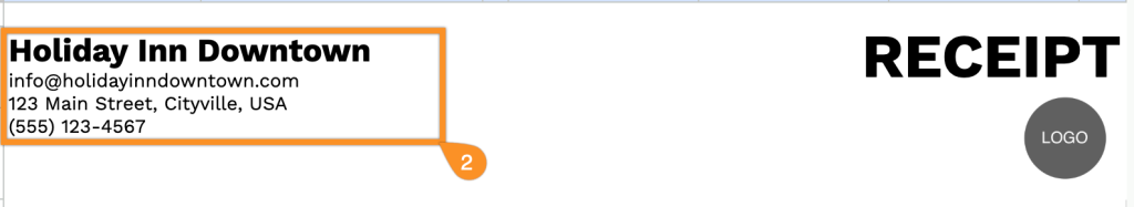 - Header section with hotel information: The template features a designated area at the top for the inn’s name, email address, physical address, and phone number, allowing for easy customization with specific property details.