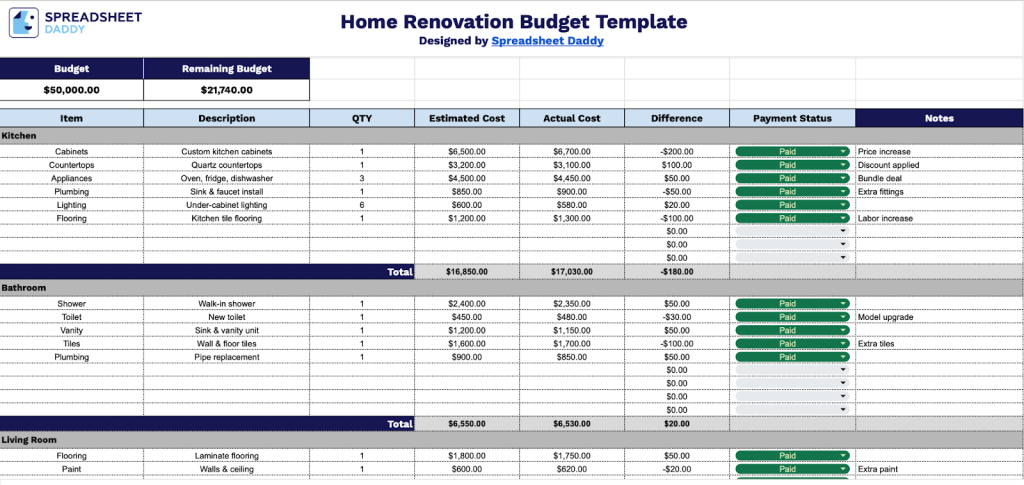 3. Then break it down into categories and list each item with its description, quantity, estimated cost, actual cost, and payment status. The template automatically totals everything and shows the difference between what you planned to spend and what you actually paid, along with the remaining budget, so that you can keep your renovation costs on track.