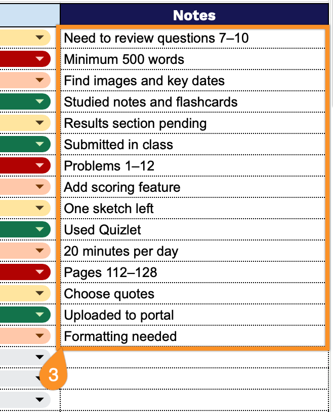 - Due date management column: The template includes a Due Date field that lets students chronologically organize their workload, helping them visualize upcoming deadlines and prioritize time-sensitive assignments to avoid last-minute rushes or missed submissions.