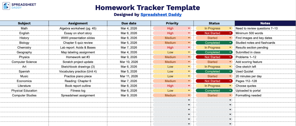 Download Spreadsheet Daddy’s Free Homework Tracker Template