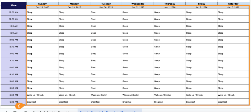 Our Hourly Schedule Template helps you organize your day in 30-minute increments from midnight to midnight.