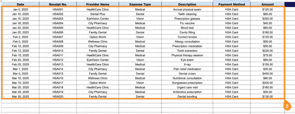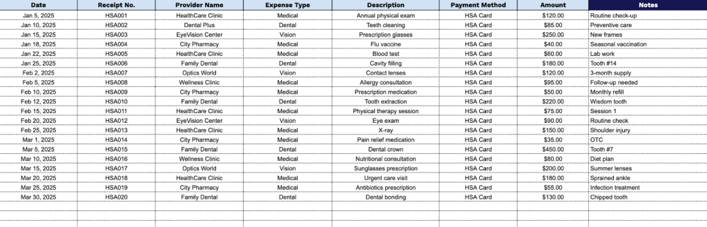 • Essential tracking fields: Captures all critical information, including Date, Receipt Number, Provider Name, Expense Type, Description, Payment Method, Amount, and Notes for comprehensive HSA expense documentation
