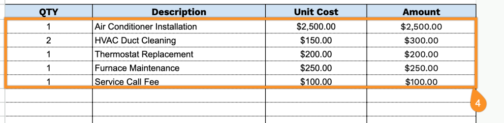 4. Itemize all HVAC parts, equipment, and services provided. Include the quantity and unit price for each item. The template will automatically calculate the line totals.