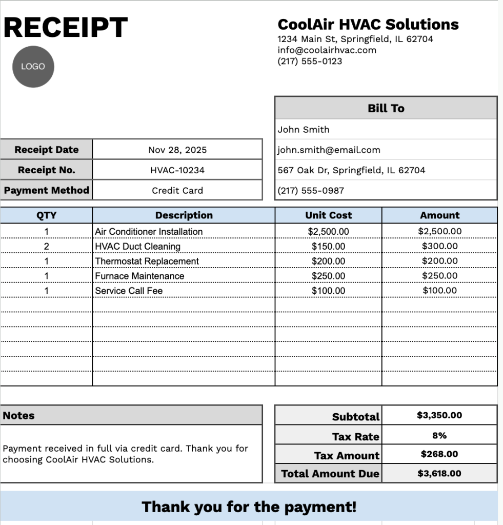 Free☝️ HVAC Receipt Template (Google Sheets, Excel, Word, Google Docs, & PDF Downloads)