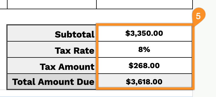 5. Enter the applicable tax rate. The template will calculate the subtotal, tax, and total amount due.