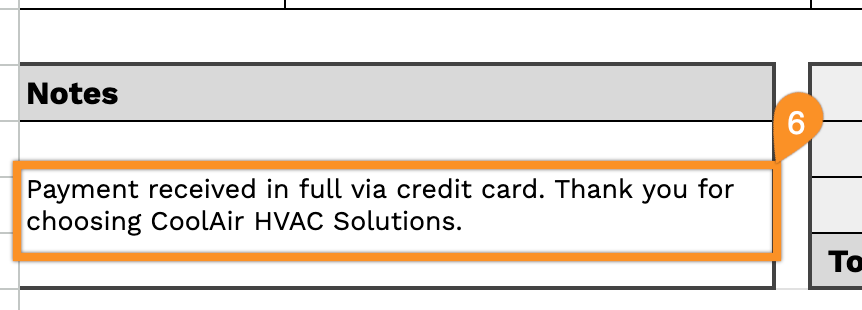 • Additional notes section with professional closing: A flexible notes field allows you to add warranty information, service recommendations, maintenance schedules, or payment terms, followed by a courteous “Thank you for the payment!” message to maintain positive customer relations.