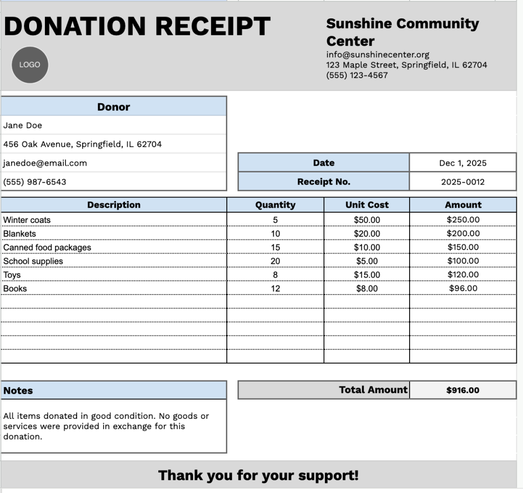 - Notes section with appreciation message: A dedicated notes area below the itemized table allows you to add tax-exemption information, donation restrictions, special acknowledgments, or other relevant details, followed by a courteous “Thank you for your support!” message to express gratitude for the donor’s generosity.