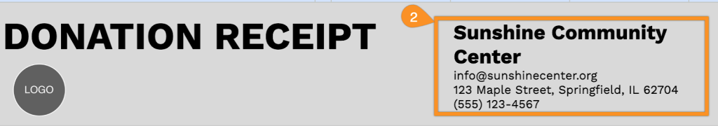 - Customizable organization information fields: The header section includes editable placeholders for company name, email address, physical address, and phone number, allowing you to quickly brand the receipt with your nonprofit or business details for professional documentation.