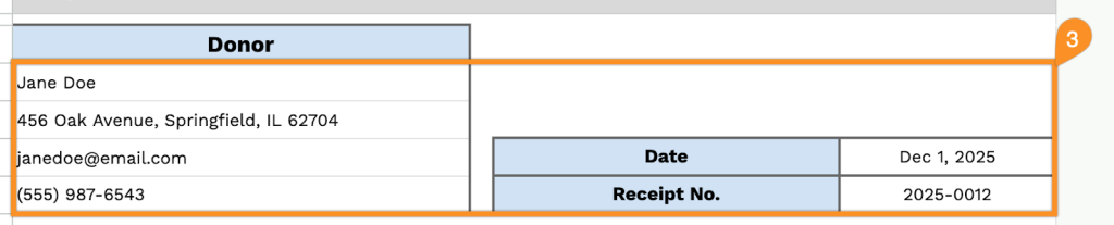 3. Fill in the donor’s information, along with the date of the donation and the receipt number.