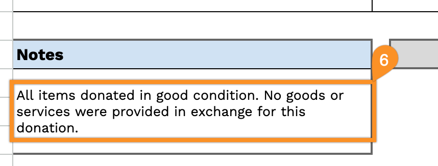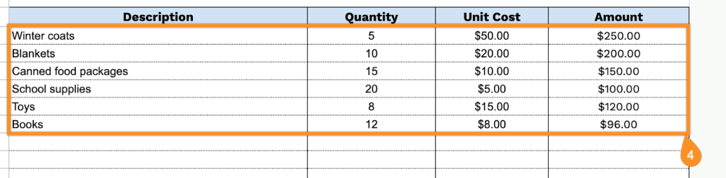 4. List the donated items, specifying the quantity and estimated value for each. The template will automatically calculate the total for each line.