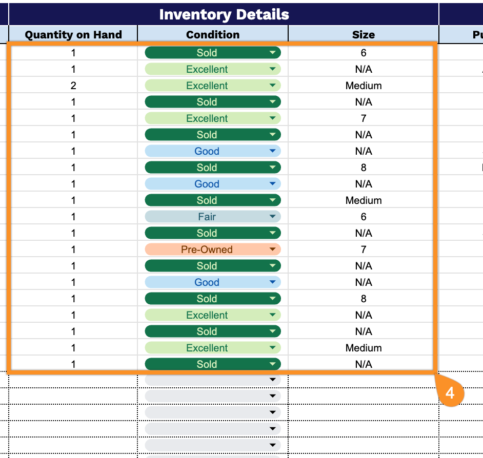 • Detailed inventory management fields: Monitor stock levels with Quantity on Hand tracking, Condition status, and Size specifications to maintain accurate records of available merchandise and product quality.